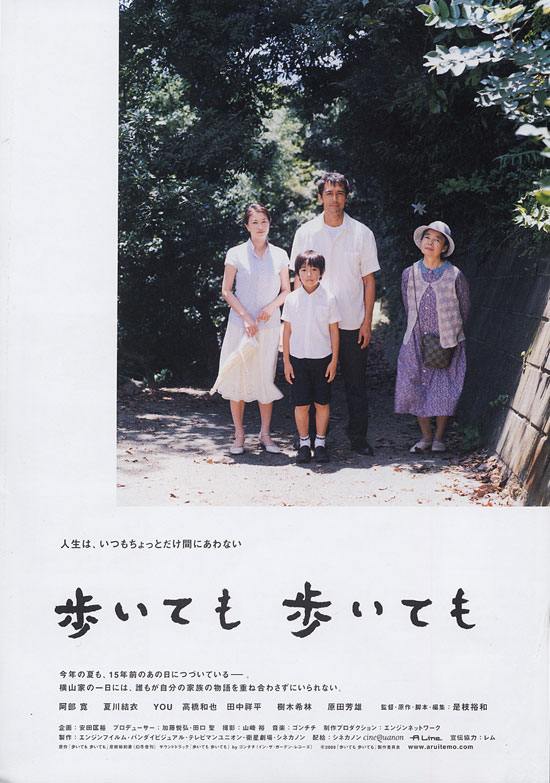从情节和题材上来看,新片《步伐不停》显得波澜不惊、质朴无华,它既不拿社会问题来吸引眼球,也没有半点刺激或猎奇的内容。影片的主角是一户再平凡不过的人家,就和我们自己的以及生活在我们身边的家庭一样。而名导的高明之处正是在于他能把看似平凡的题材拍得有滋有味、引人入胜。片中横山一家的构成颇为微妙,它可以解构为三个不同类型的小家庭——新近再婚的良多一家,其乐融融的千奈美一家,以及在同一屋檐下厮守了几十年的老夫妇。而三代人在已故长子的忌日聚首,又勾起了人物内心的执念和往事,在美好的天伦之乐中,暗含着矛盾和冲突的潜流。是枝导演只叙述了横山一家一天的活动。在这二十四小时之中,人物之间的日常唠嗑推动着情节的发展,诉说出一个家庭的错综关系和数十年的历史。